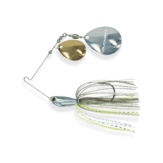 The perfect combination between design and functionality, the Duckett Waterslash Double Colorado Spinnerbaits compact size allows it to succeed in the toughest fishing condition where a finesse spinnerbait presentation is required to catch more fish. Its form is slightly compressed on the head, which gives it better balance at any retrieve speed. The blade weight is also specifically set to not overload the spinnerbait, and kick blades into action immediately after each cast. The Duckett Waterslash Double Colorado Spinnerbaits is made with a special steel wire that increases vibration, and it is also backed with a sharp OMTD hook. Available in a variety of colors, the Duckett Waterslash Double Colorado Spinnerbaits also features a hand-tied fine cut silicone skirt for additional lifelike action typical of schooling baitfish.